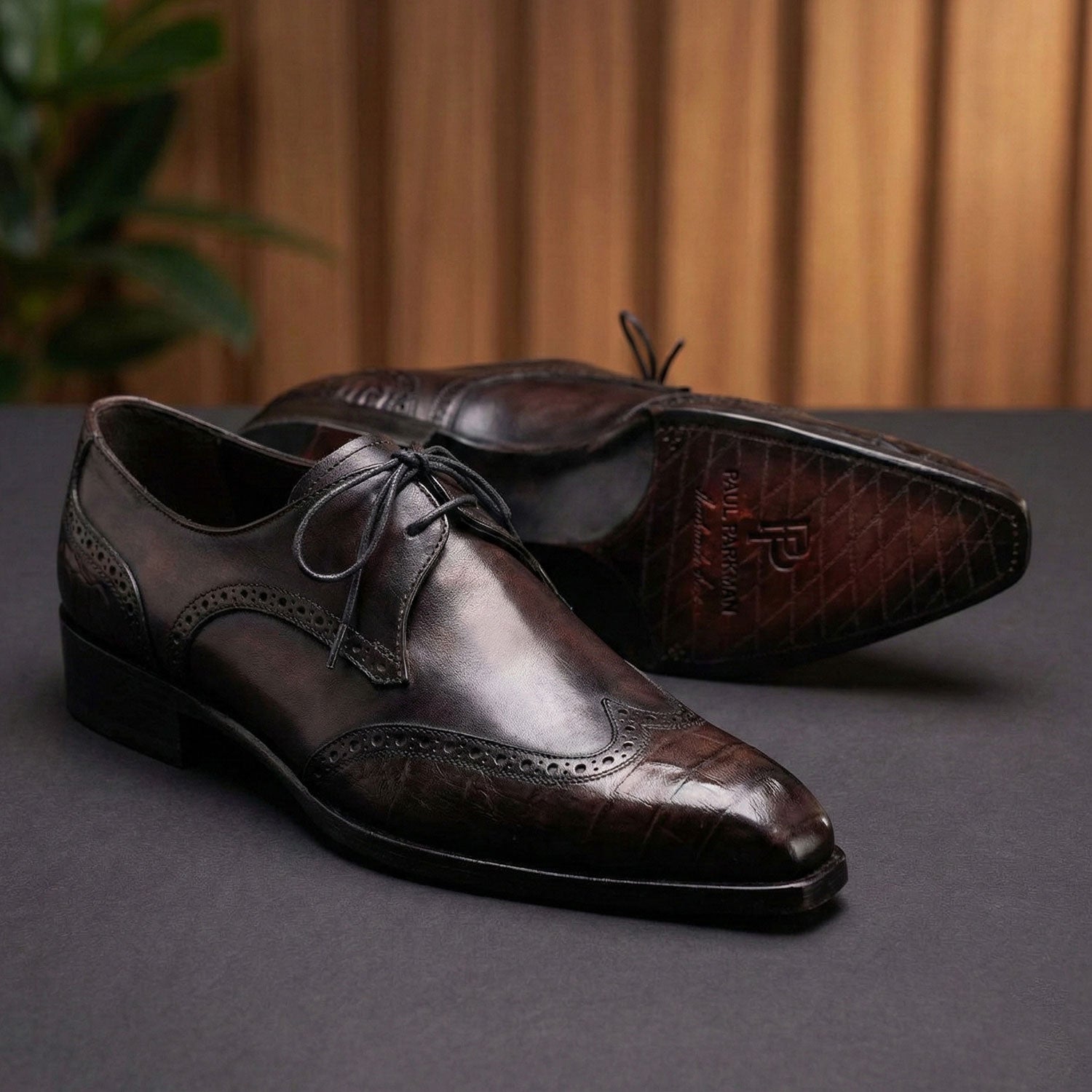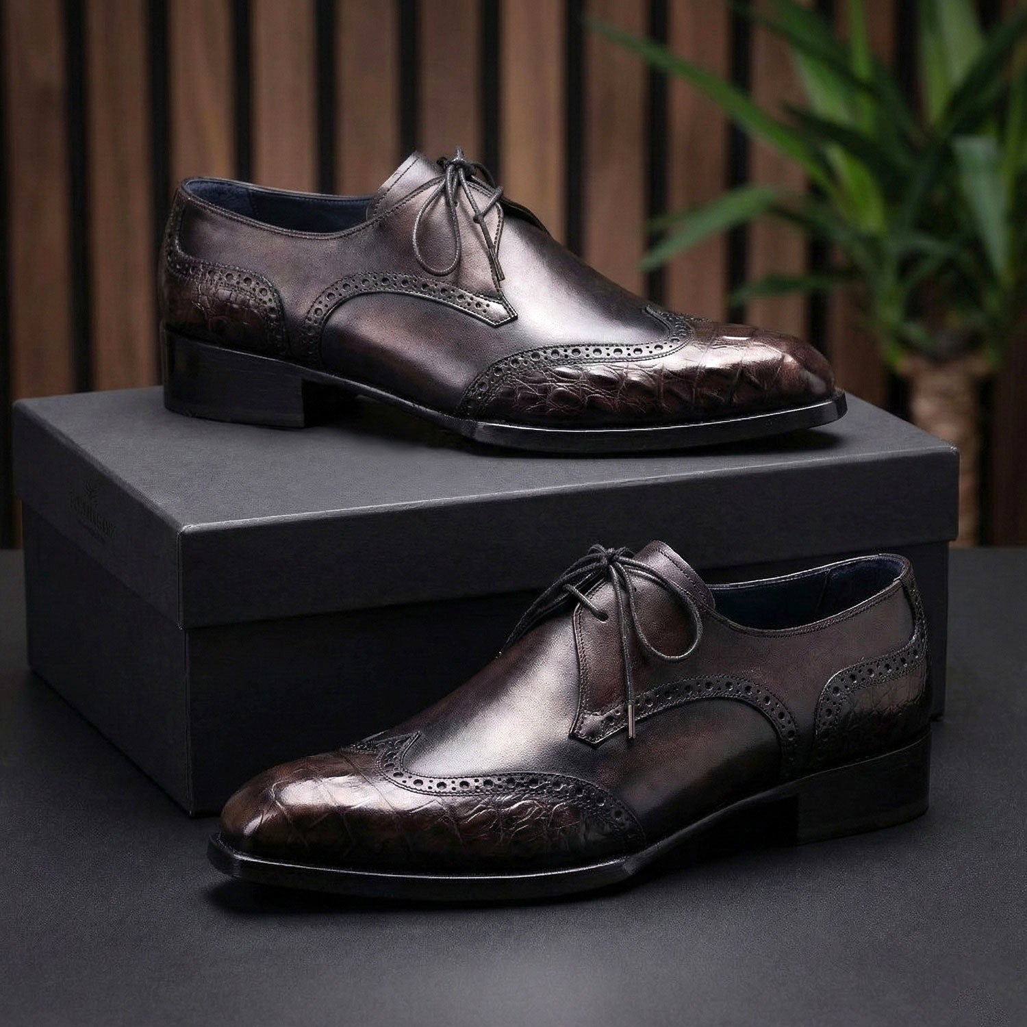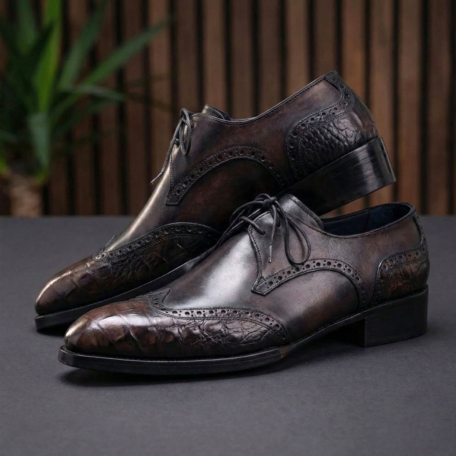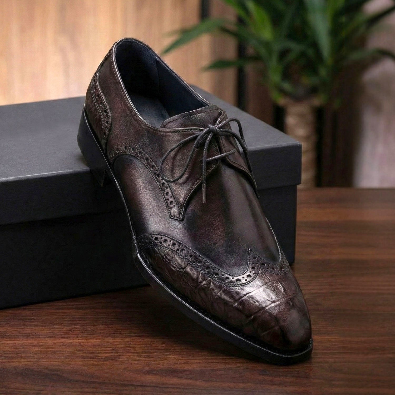 - Anthracite black crocodile textured leather wingtip upper enhanced by a soft burgundy gradient at the toe.