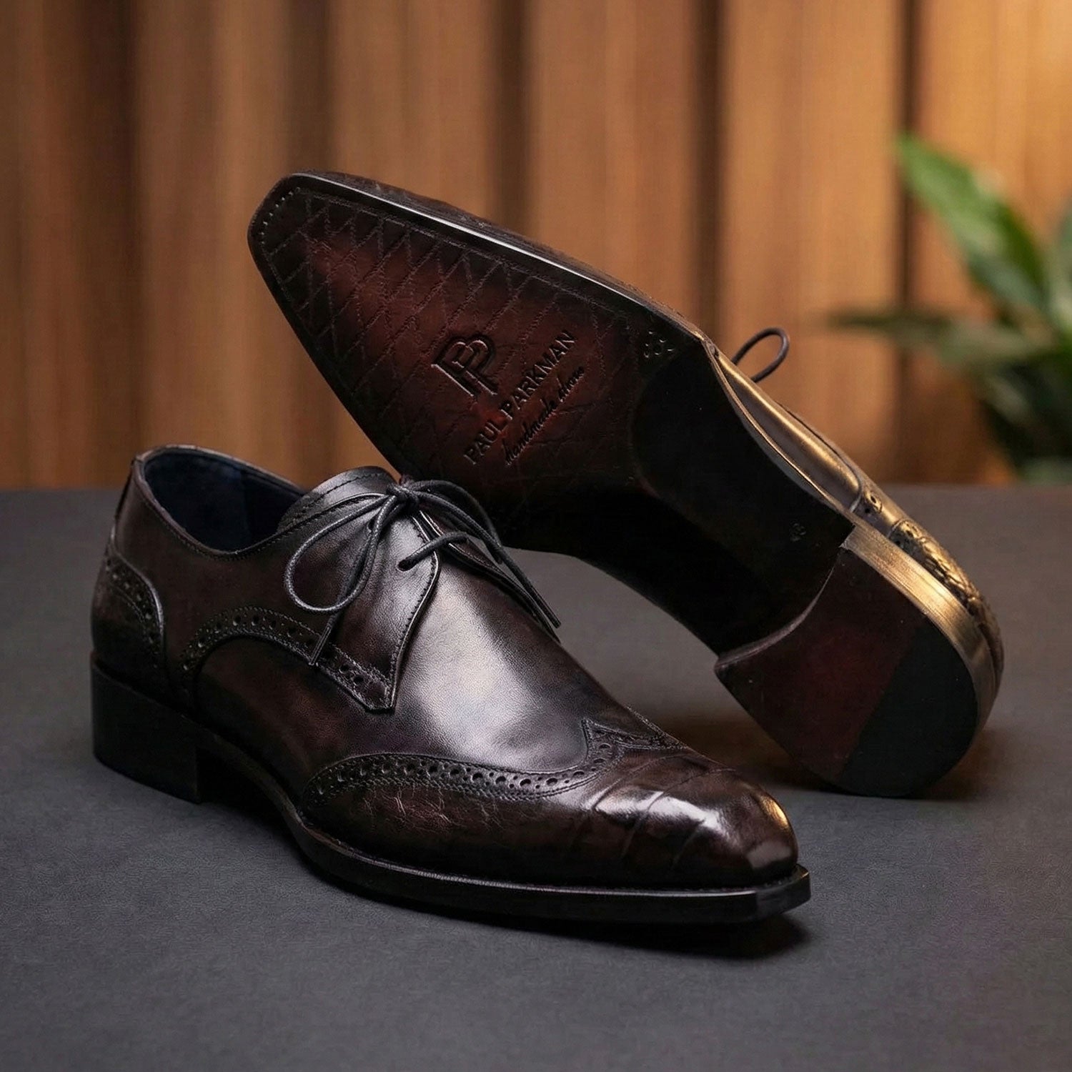 - Handmade wingtip derby shoes for men.